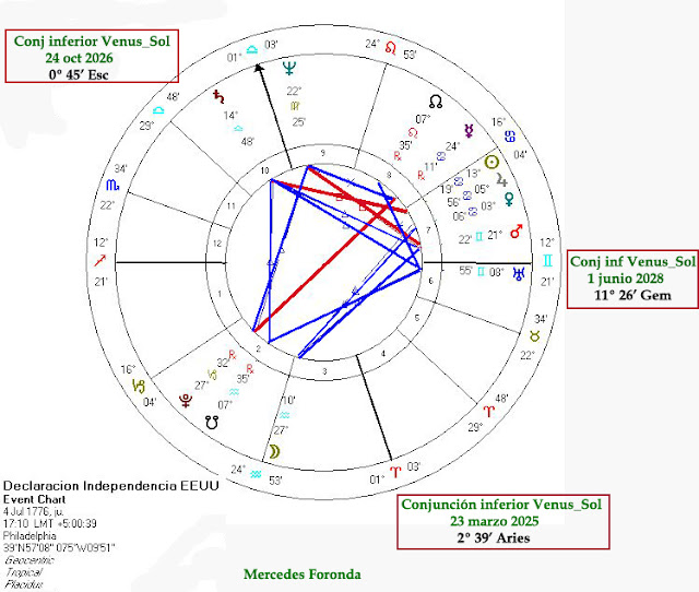 Nótese cómo se activan las cúspides angulares IV y VII con las conjunciones inferiores Venus_Sol (octenio 2020-2028) en la figura de la Independencia de Estados Unidos desde la toma de posesión de Donald Trump.